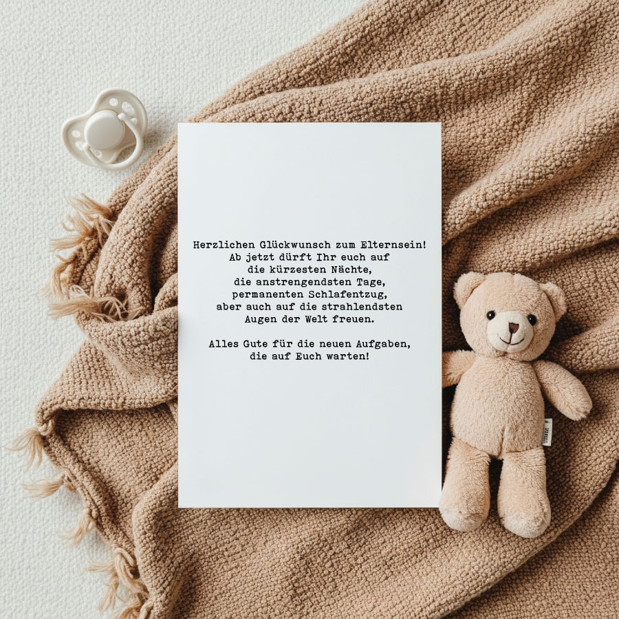 Die Geburt eines Kindes ist ein Moment, in dem die Welt für einen Augenblick stillsteht, denn eine wundervolle neue Lebensgeschichte beginnt. Jeder Gedanke, jedes Wort, jede Glückwunschkarte, die Sie in diesem Moment den frischgebackenen Eltern schenken, ist ein Teil dieser Geschichte und bleibt den Eltern in schöner Erinnerung.