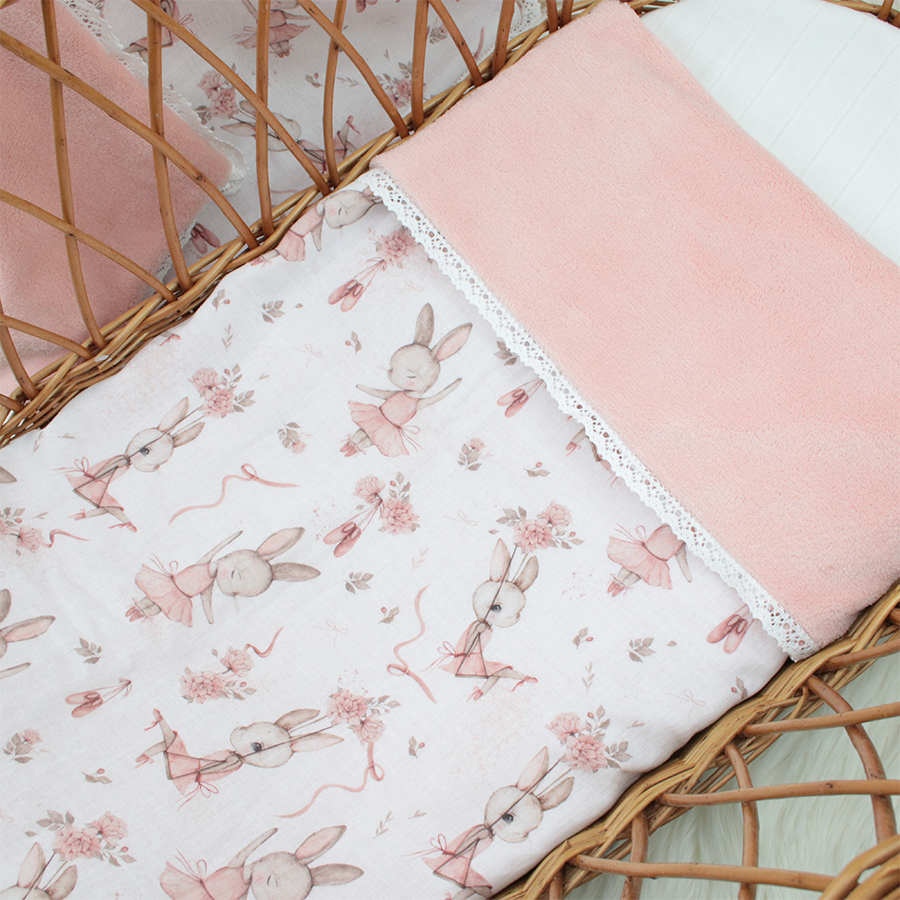 Die Babydecke wird handgefertigt in Slowenien. Sie besteht aus 4 Lagen, auf beiden Seiten befindet sich atmungsaktiver doppellagiger Musselin, der mit slowenischer Häkelspitze eingefasst ist – perfekt für wärmere Tage. Damit die Decke noch einzigartiger und unersetzlich wird, können wir auch den Namen des Neugeborenen darauf sticken. Sie können die Decke mit dem gestickten Namen des Babys oder in einer schlichten Variante ohne Personalisierung wählen. Stellen Sie sich das Gefühl einer Umarmung vor, die den ganzen Tag anhält – genau das vermittelt unsere personalisierte Decke. Passend dazu können Sie auch unser handgefertigtes Schmusetuch Häschen hinzufügen.
