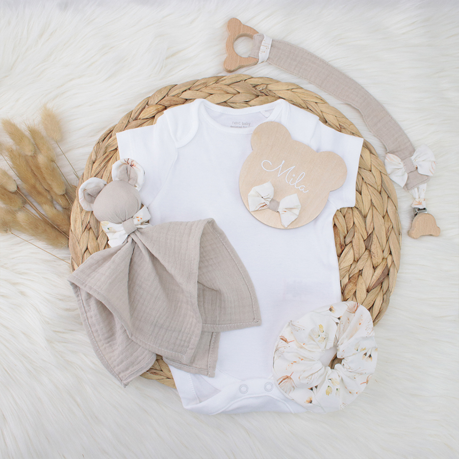 Alle unsere Pakete werden in einem hübschen Beutel geliefert, in dem sich eine kleine Schachtel mit Ihrem Geschenk verbirgt. Die Produkte sind in weißes Geschenkpapier eingewickelt, da wir der Meinung sind, dass der erste Eindruck in dieser schönsten Lebensphase besonders wichtig ist.
