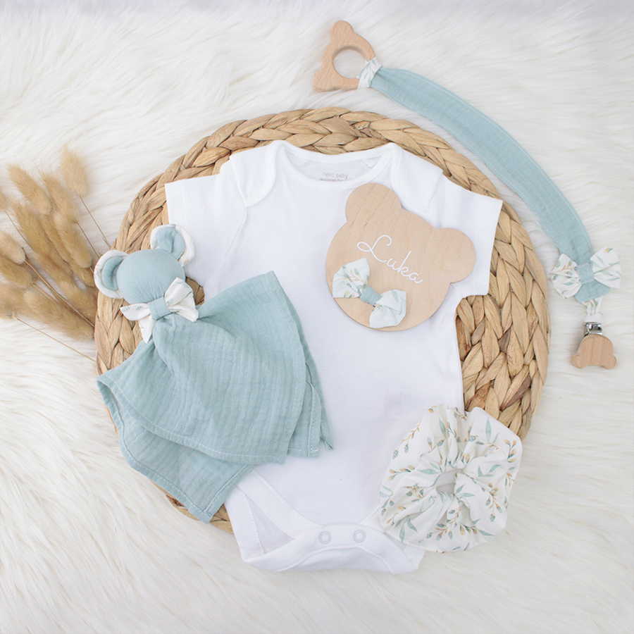 Alle unsere Pakete werden in einem hübschen Beutel geliefert, in dem sich eine kleine Schachtel mit Ihrem Geschenk verbirgt. Die Produkte sind in weißes Geschenkpapier eingewickelt, da wir der Meinung sind, dass der erste Eindruck in dieser schönsten Lebensphase besonders wichtig ist.