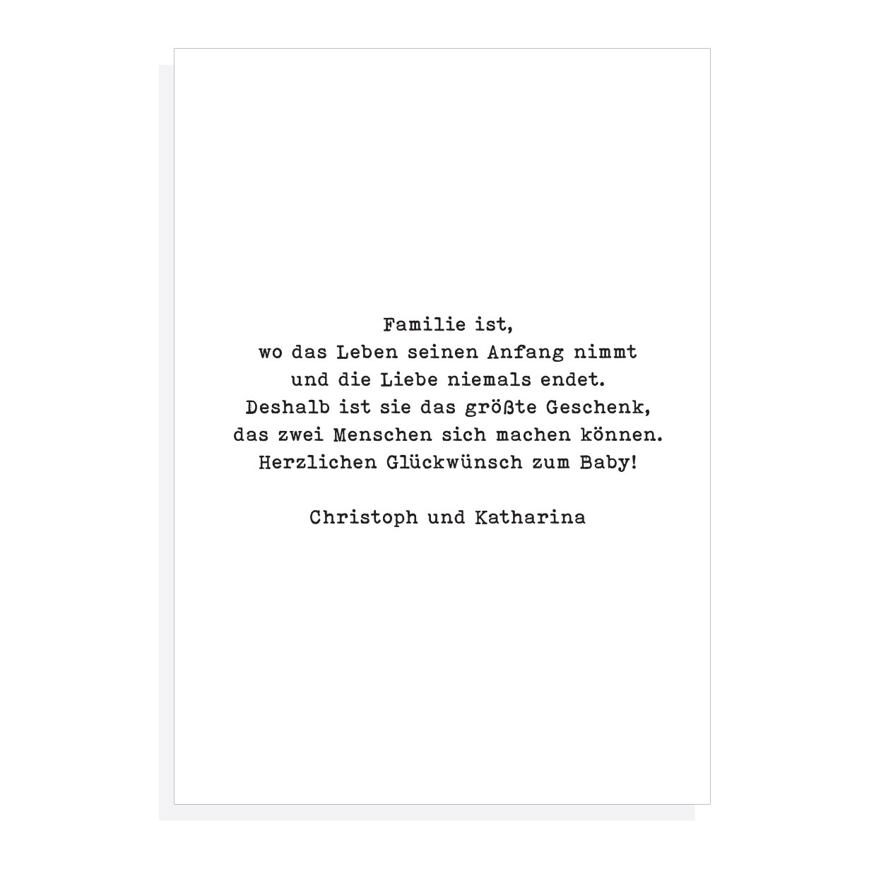 Unsere personalisierte Karte passt perfekt zu jedem Geschenk und bringt eine zusätzliche Portion Liebe und Aufmerksamkeit mit. Ob als Teil eines Geschenkpakets oder als Einzelgeschenk – diese Karte wird zu einer unvergesslichen Erinnerung an den Beginn eines neuen, glücklichen Kapitels im Leben der Familie.