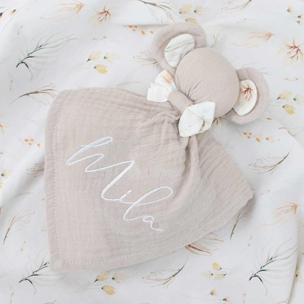 Das Baby-Schmusetuch, auch Kuscheltuch genannt, ist unsere Handarbeit. Es besteht aus zweilagigem, atmungsaktivem Musselin, während die Ohren- und Schleifendetails aus Baumwolle gefertigt sind. Das Schmusetuch ist ein wunderbares Geschenk für Neugeborene, da es Geborgenheit und Wärme spendet, wann immer es gebraucht wird, und sicher ein unverzichtbarer Begleiter im Aufwachsen des Kindes wird. Mit einer zusätzlichen Glückwunschkarte wird das Geschenk für Eltern und Baby perfekt. Entdecken Sie auch weitere Produkte aus der Kollektion Bär by Izzie.